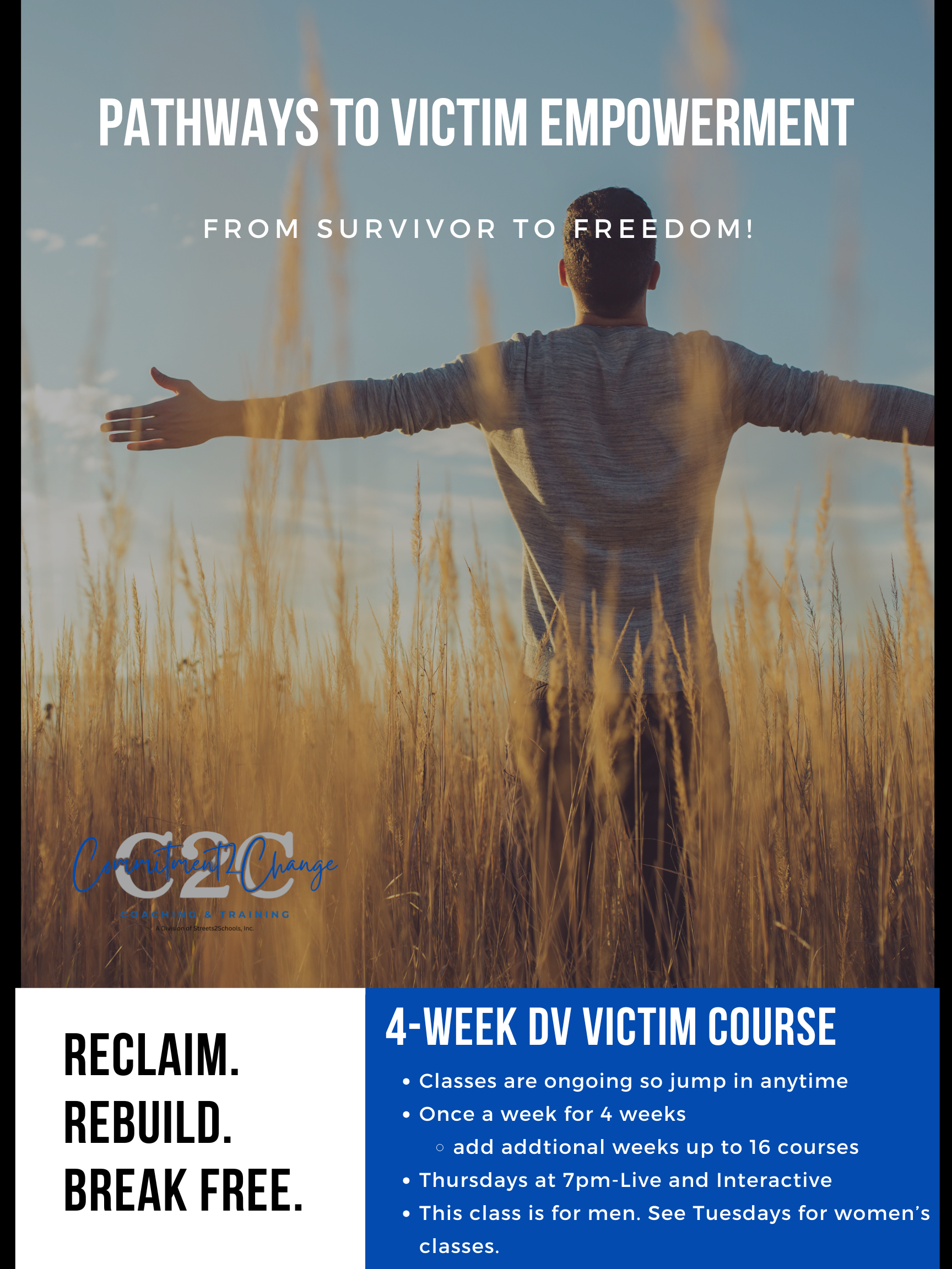 Begin with our 4-week Domestic Violence Recovery Class, designed to support individuals who have experienced the impact of domestic violence and are ready to move forward with strength and clarity. Add up to 16 weeks, to break free from harmful patterns, rebuild confidence, and begin a journey toward healing and empowerment. This live, interactive course offers a safe and supportive space to explore key topics such as understanding the effects of abuse, recognizing red flags, reclaiming personal power, and developing healthy coping strategies.